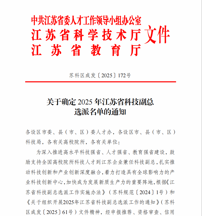 日前,由省委人才办、省科技厅、省教育厅联合开展的江苏省科技副总选派工作,经过一系列严格有序的组织申报、材料汇总、项目遴选与专家评审等环节,并通过江苏省科技厅对2025年江苏省科技副总拟选派对象进行了公示,全省共计拟选派2333名江苏省科技副总,我校有57人入选。