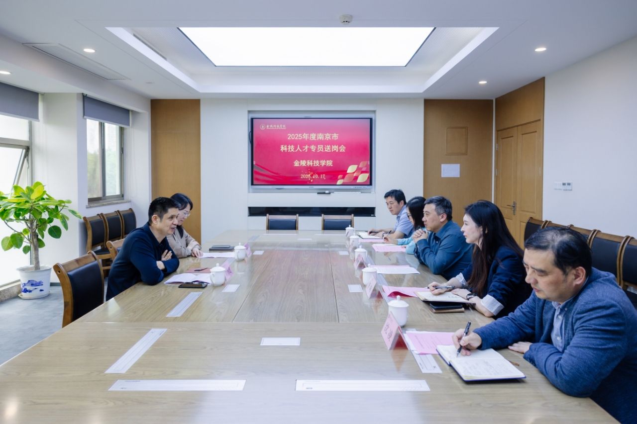 2025年10月17日,我校举行南京市科技人才专员送岗交流会,南京东南国资投资集团有限责任公司党委副书记、董事刘妙雄,南京市驻我校科技人才专员、南京东南国资投资集团有限责任公司党群工作部副部长刘菲菲来校送岗交流。校长季赛出席会议。