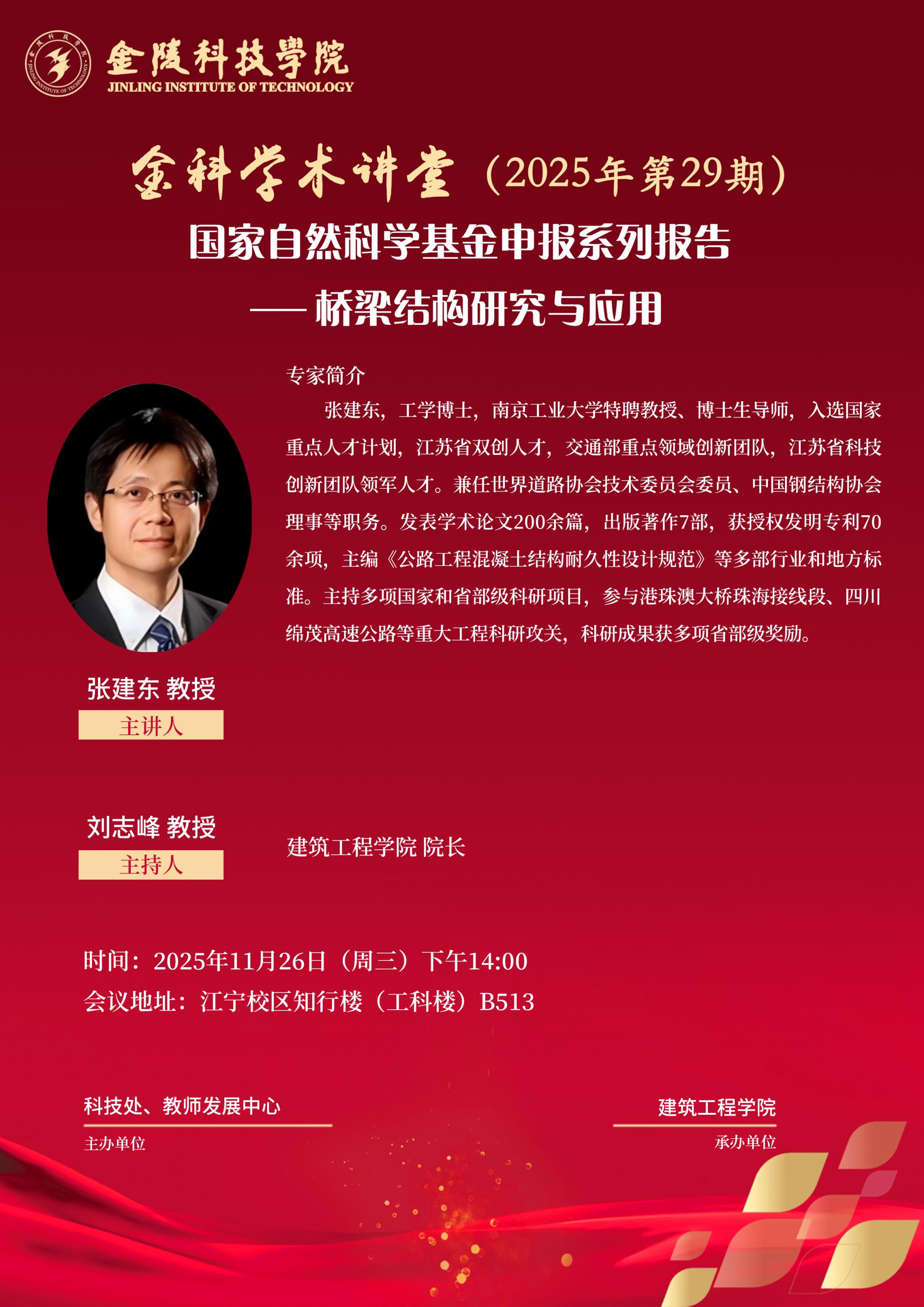 【学术预告】关于举办线下“金科学术讲堂:国家自然科学基金申报系列报告——桥梁结构研究与应用”学术报告的通知